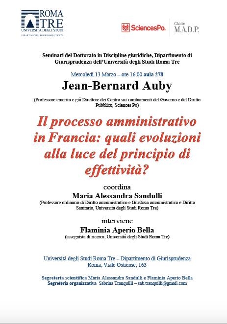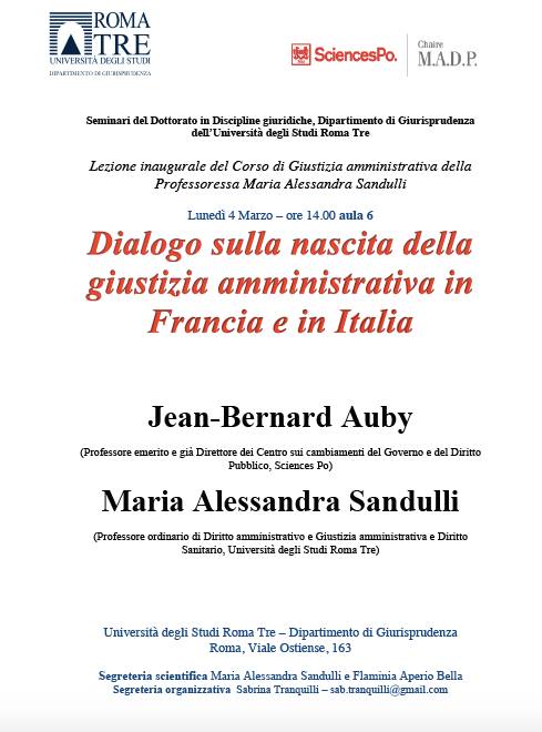 Lunedì 4 marzo p.v. dalle ore 14:00, prende il via presso l’Università Roma Tre un ciclo di tre incontri dedicati rispettivamente al “Dialogo sulla nascita della giustizia amministrativa in Francia e in Italia”, “Il processo amministrativo in Francia: quali evoluzioni alla luce del principio di effettività” (13 marzo p.v.) e “intelligenza artificiale e diritto amministrativo” (18 marzo p.v.).