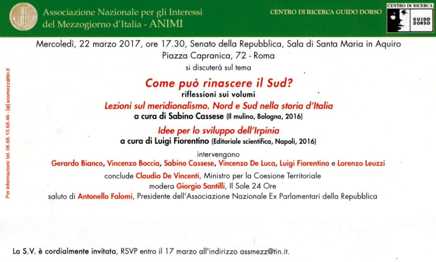 22 Marzo 2017 Come può rinascere il Sud? – – – RSVP – entro il 17 marzo, all’indirizzo assmezz@tin.it