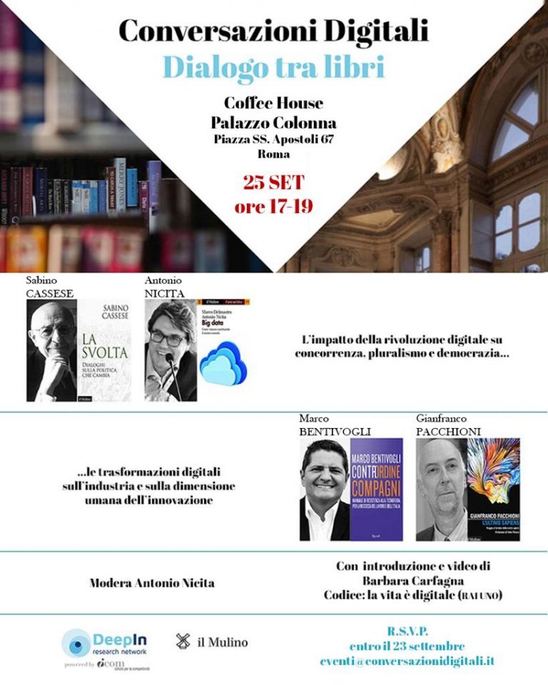 Il prossimo 25 settembre, presso la Coffee House di Palazzo Colonna in Roma, si terrà l’evento Conversazioni Digitali. Dialogo tra libri.