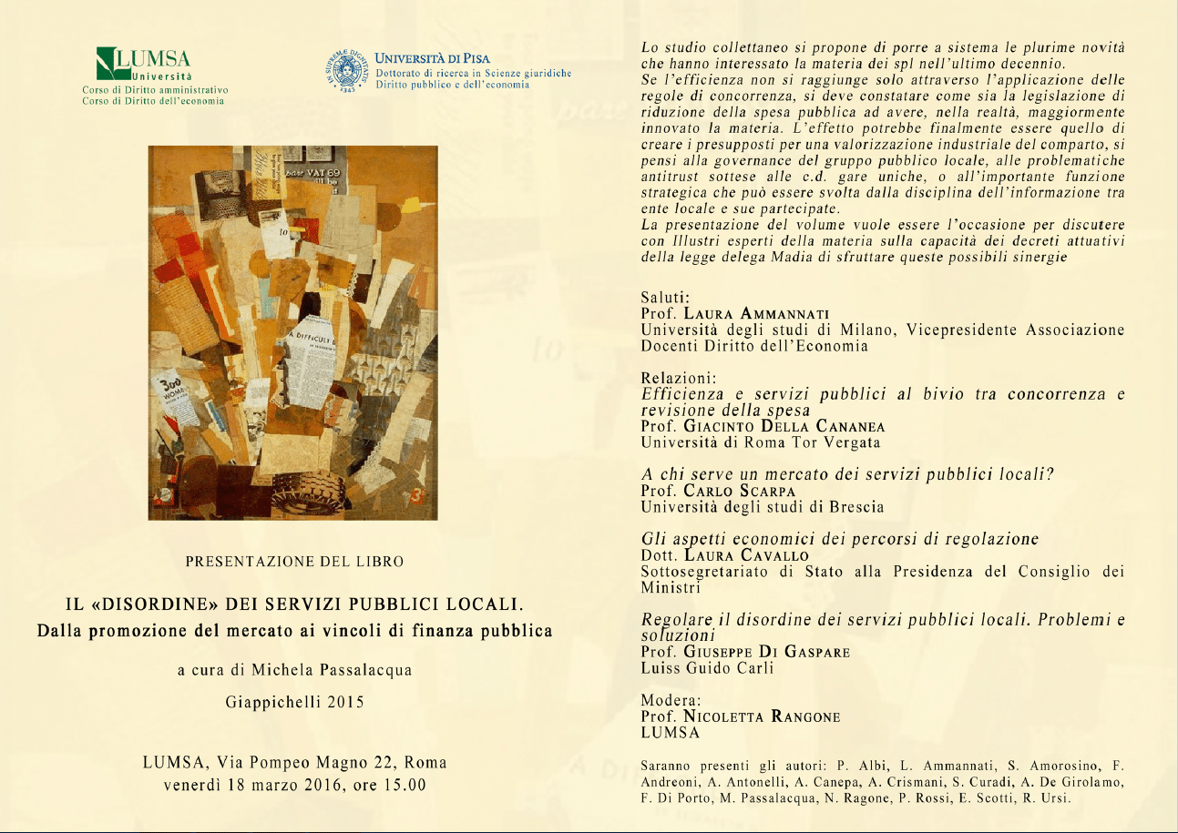 Si terrà la presentazione del libro “Il disordine dei servizi pubblici locali”, a cura di Michela Passalaqua.