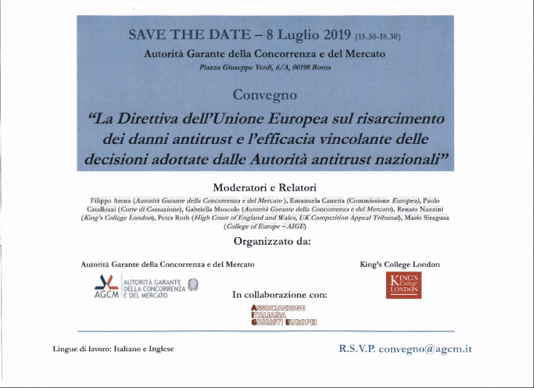 Il convegno è organizzato dall’AGCM in collaborazione con l’Associazione italiana giuristi europei e il King’s College of London.