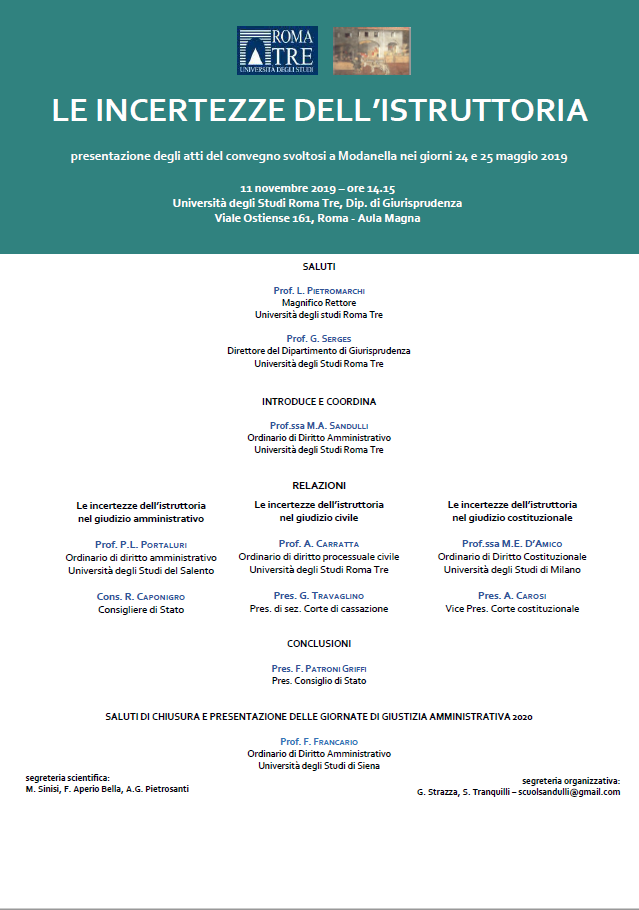 Il prossimo 11 novembre, presso l’Università Roma Tre, si terrà un convegno sulle incertezze dell’istruttoria nei giudizi amministrativo, civile e costituzionale.