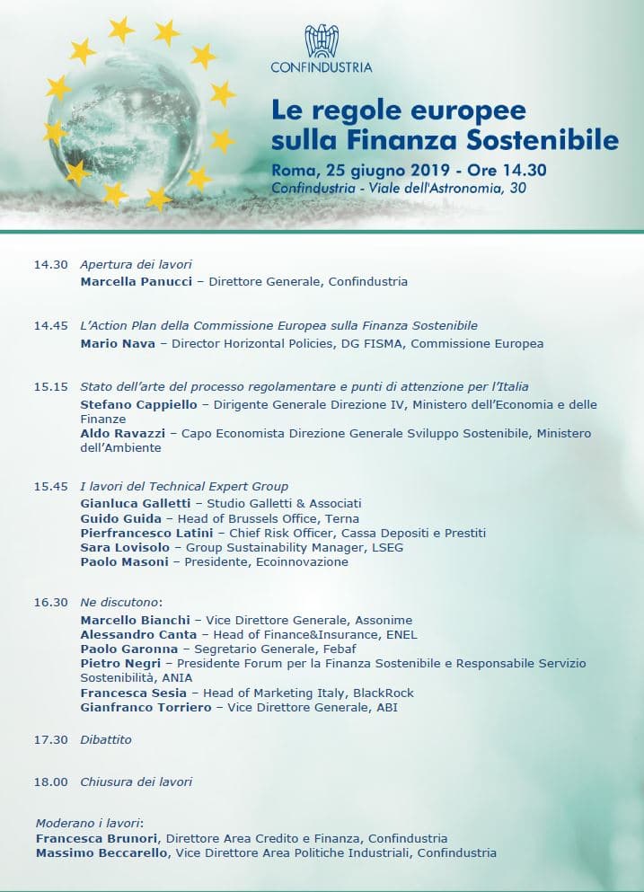 Il prossimo 25 giugno, a partire dalle ore 14,30, presso la sede di Confindustria di Roma (Viale dell’Astronomia, 30) si terrà il convegno sul tema Le regole europee sulla finanza sostenibile.