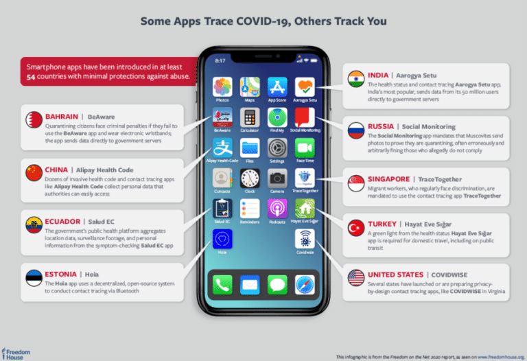 Alcuni esempi: in India, l’app Aarogya Setu raccoglie le informazioni sugli spostamenti di ciascun utente e li trasferisce direttamente a un database controllato dal governo. In alcune città la violazione dell’obbligo di installazione dell’app sul cellulare è perseguibile penalmente. Un’altra applicazione, utilizzata dal governo federale del Karnataka, impone agli utenti di scattare una fotografia a intervalli periodici e di pubblicarla attraverso l’applicazione, unitamente ai metadati sulla localizzazione. Anche in Russia, l’app Social Monitoring chiede agli utenti di scattare fotografie di se stessi (selfie) per dimostrare il rispetto dei vincoli agli spostamenti. In meno di un mese, le autorità di polizia russe hanno elevato oltre 54,000 sanzioni amministrative a carico degli inadempimenti. In Arabia Saudita, la Tetamman app impone agli utenti anche l’uso di un braccialetto bluetooth. Il mancato rispetto delle norme comporta una sanzione pecuniaria e fino a due anni di reclusione.