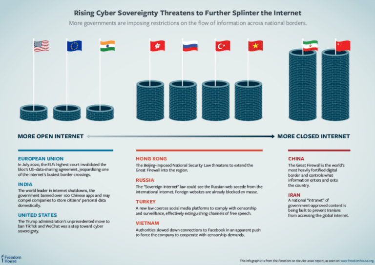 L’ultima area di libertà a preoccupare gli autori del rapporto riguarda la regolazione di Internet. Le misure adottate dai governi per contenere la curva epidemiologica o introdurre forme di sostegno all’economia hanno avuto ricadute anche sul quadro normativo a presidio di Internet. In molti casi, denuncia il rapporto, questo ha consentito ai governi di affermare nuovi spazi di sovranità digitale.