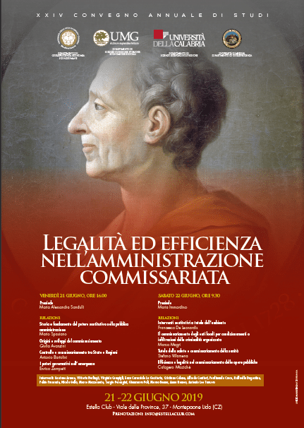 Nei giorni 21 e 22 giugno 2019, presso l’Estella Club di Montepaone Lido (Cosenza) si terrà il XXIV Convegno Annuale di Studi sul tema Legalità ed efficienza nell’amministrazione commissariata, organizzato dal Dipartimento di Giurisprudenza Economia e Scienze Umane dell’Università degli Studi di Reggio Calabria, in collaborazione con l’Università della Calabria e l’Università di Messina.