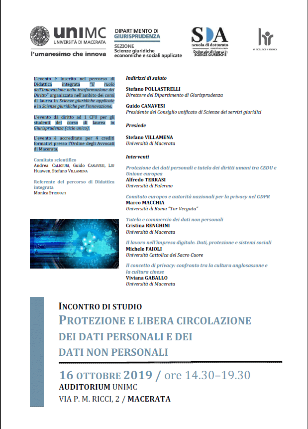 Il prossimo 16 ottobre, dalle ore 14,30, presso l’Auditorium Unimc dell’Università degli Studi di Macerata, si terrà l’incontro di studio sul tema della Protezione e libera circolazione dei dati personali e dei dati non personali.