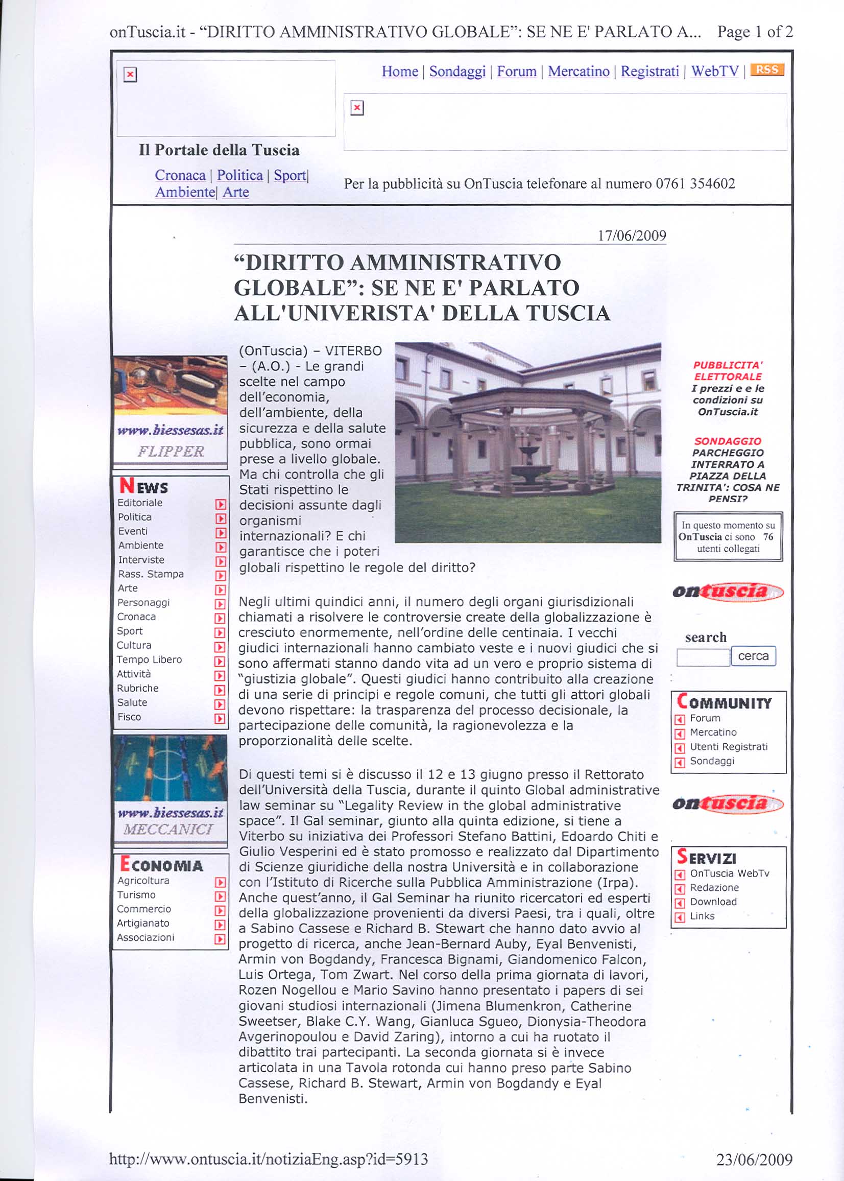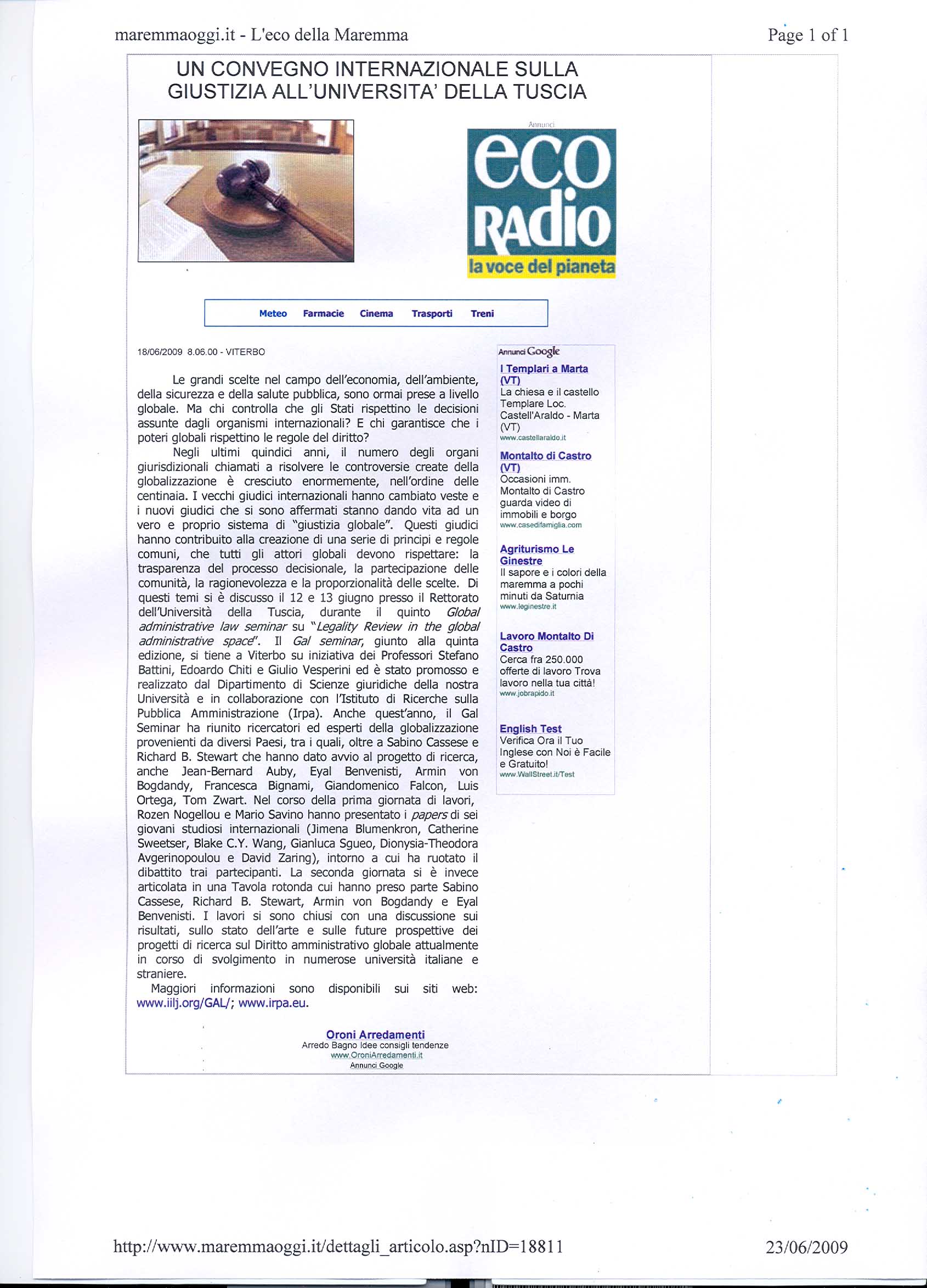 The fifth Viterbo seminar on global administrative law was held on June 12-13, 2009. It was hosted by Professors Stefano Battini, Giulio Vesperini and Edoardo Chiti, together with an organizational team led by Martina Conticelli. The seminar was sponsored by Finmeccanica Spa and Fondazione del Monte di Bologna e Ravenna.