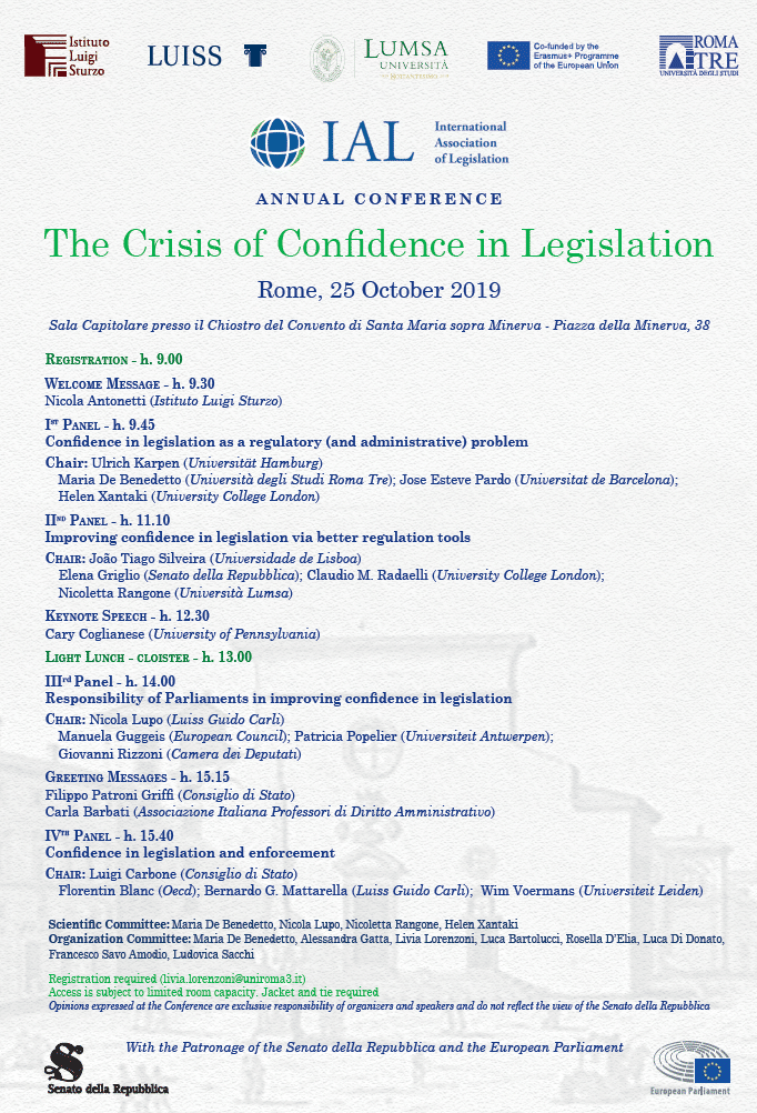 Il prossimo 25 ottobre, nella Sala Capitolare presso il Chiostro del Convento di Santa Maria sopra Minerva (Roma), si terrà la conferenza annuale dell’International Association of Legislation sul tema The Crisis of Confidence in Legislation.